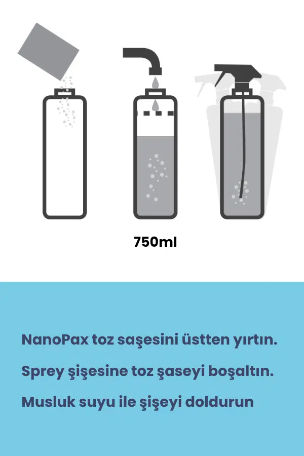 1 SAŞE = 750ML MİKRO KÖPÜKLÜ SPREYE ATILIR.