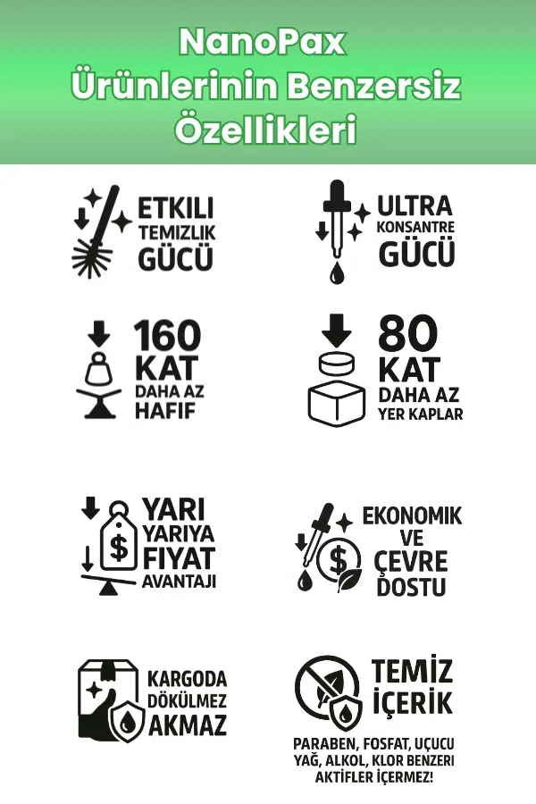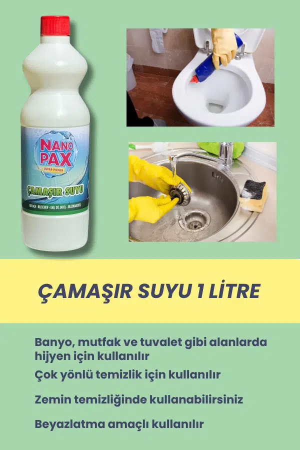 Nanopax çamaşır suyu çözeltisini mutfaklarda da kullanabilirsiniz. Iç granit tezgahlar dahil mutfak yüzeyleri çamaşır suyu ile temizlenebilir. Buzdolabında, mutfak lavabosunda ve dış ünitelerde de uygulayabilirsiniz. Ayrıca seyreltilmiş bir çamaşır suyunu, çocuk oyuncaklarını, duş perdelerini, bahçe mobilyalarını ve duyarlı neredeyse tüm sert yüzeyleri zararlı organizmalardan temizlemek ve hijyen hale getirmek için kullanabilirsiniz.