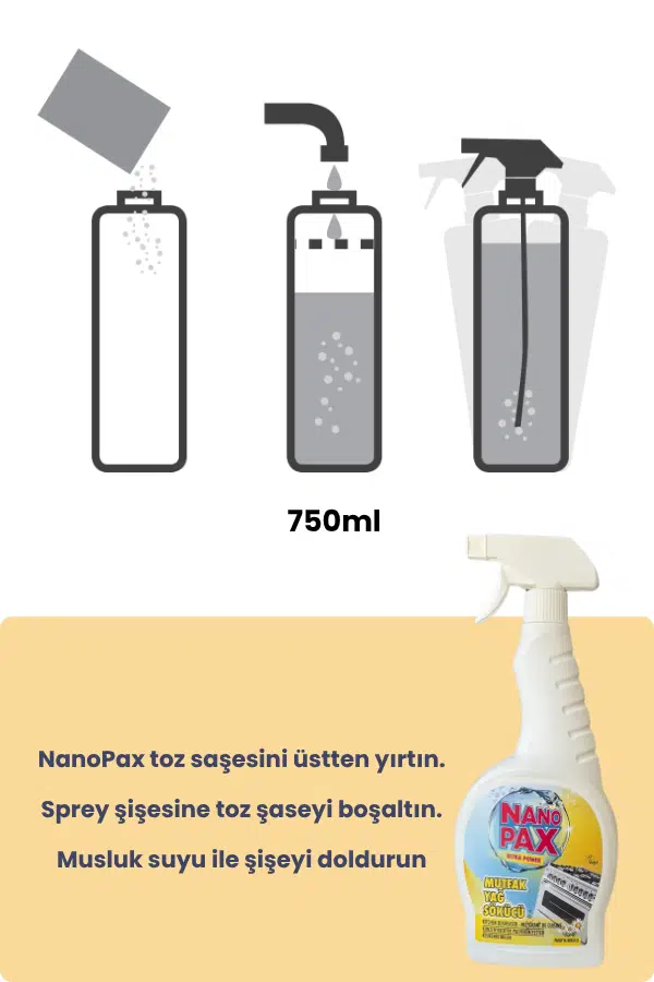 750 ML NANOPAX MUTFAK YAĞ SÖKÜCÜ SIVI SPREY KULLANIMA HAZIRDIR.